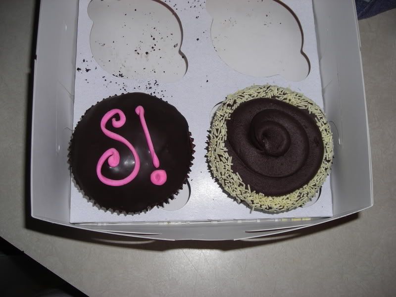Today a lady representing a MRI place we use dropped these and 2 more (which were devoured by Derek and I before pictures could be taken) off at our office. The pictures do them no justice. These were the most beautiful cupcakes I've ever seen, AND the lady even went to the trouble to put an "S!" on one of them in honor of me starting at the office. I have requested that she bring healthy stuff in the future to keep me from getting fat. Its nuts! We get stuff like this all day. Today people dropped off 4 cupcakes, 4 bags of Chex Mix, and 4 packages of cheese and peanut butter crackers, and today was a light day. They bring us lunch, smoothies, cookies, ice cream and any other junk you can imagine. I am starting a weight loss plan in the damn danger zone.